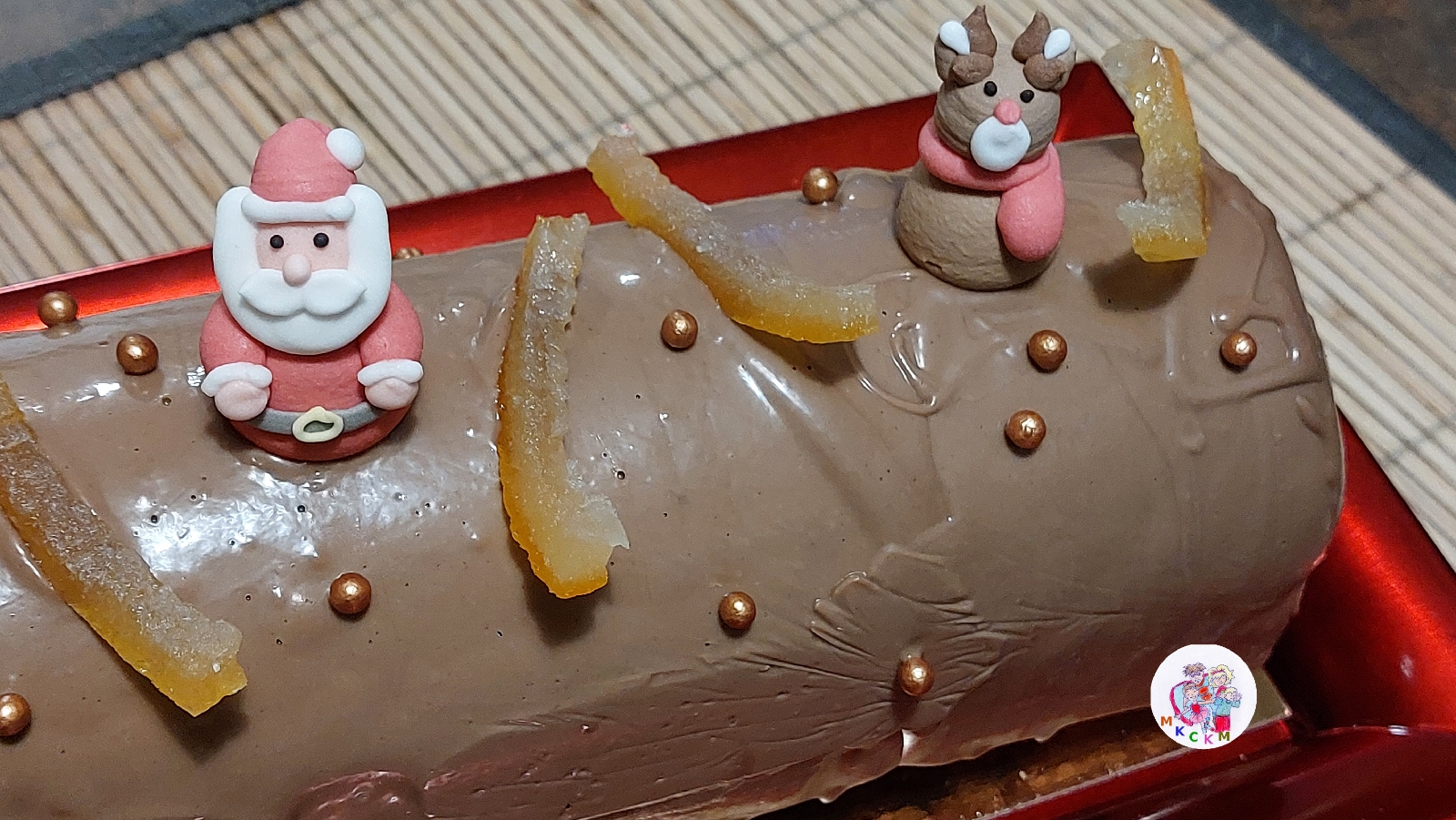 J'ai décoré ma bûche avec de petits éléments en sucre et quelques oranges confites.