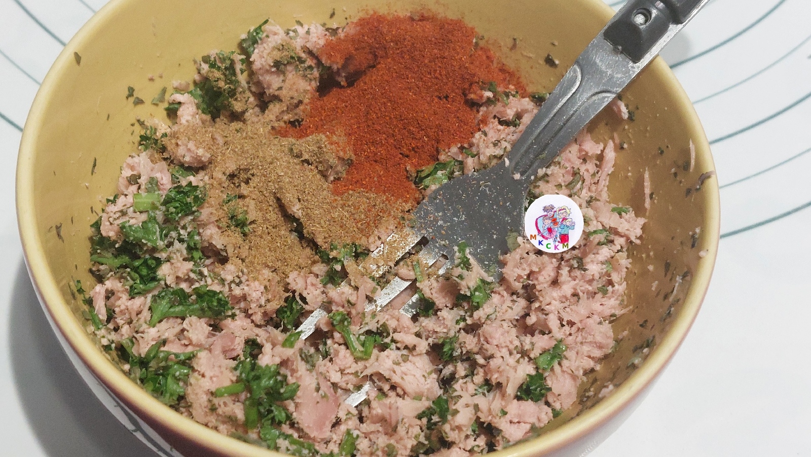 Dans un saladier, émietter le thon égoutté en petit morceau, l’œuf dur écrasé à la fourchette, les herbes aromatiques, les épices et le jus de citron. Mélanger bien.