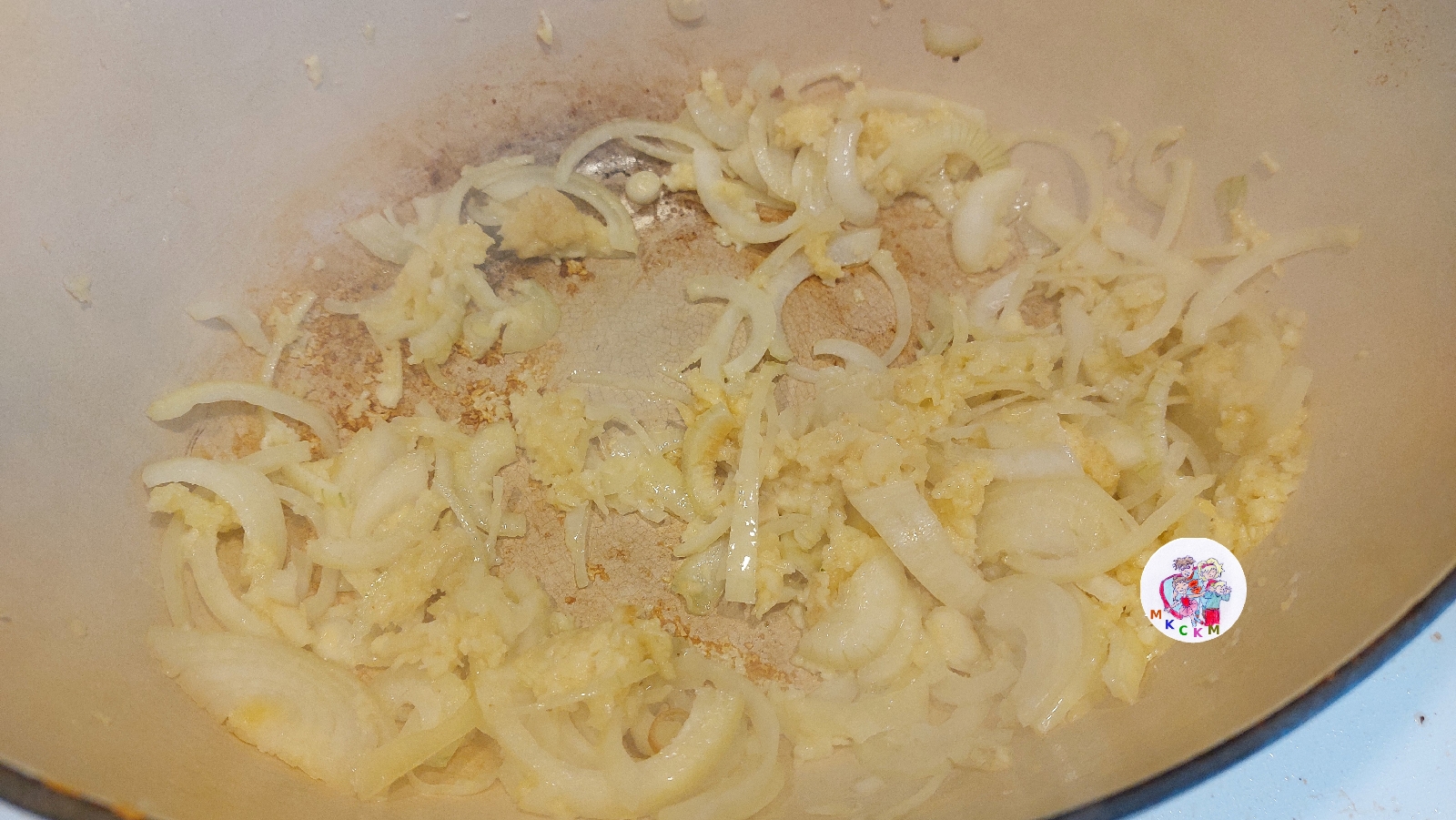 Dans une poêle, ajouter la viande par lots et la faire dorer de tous les côtés. Une fois la cuisson terminée, la mettre avec tout le jus de cuisson dans la casserole avec les oignons.